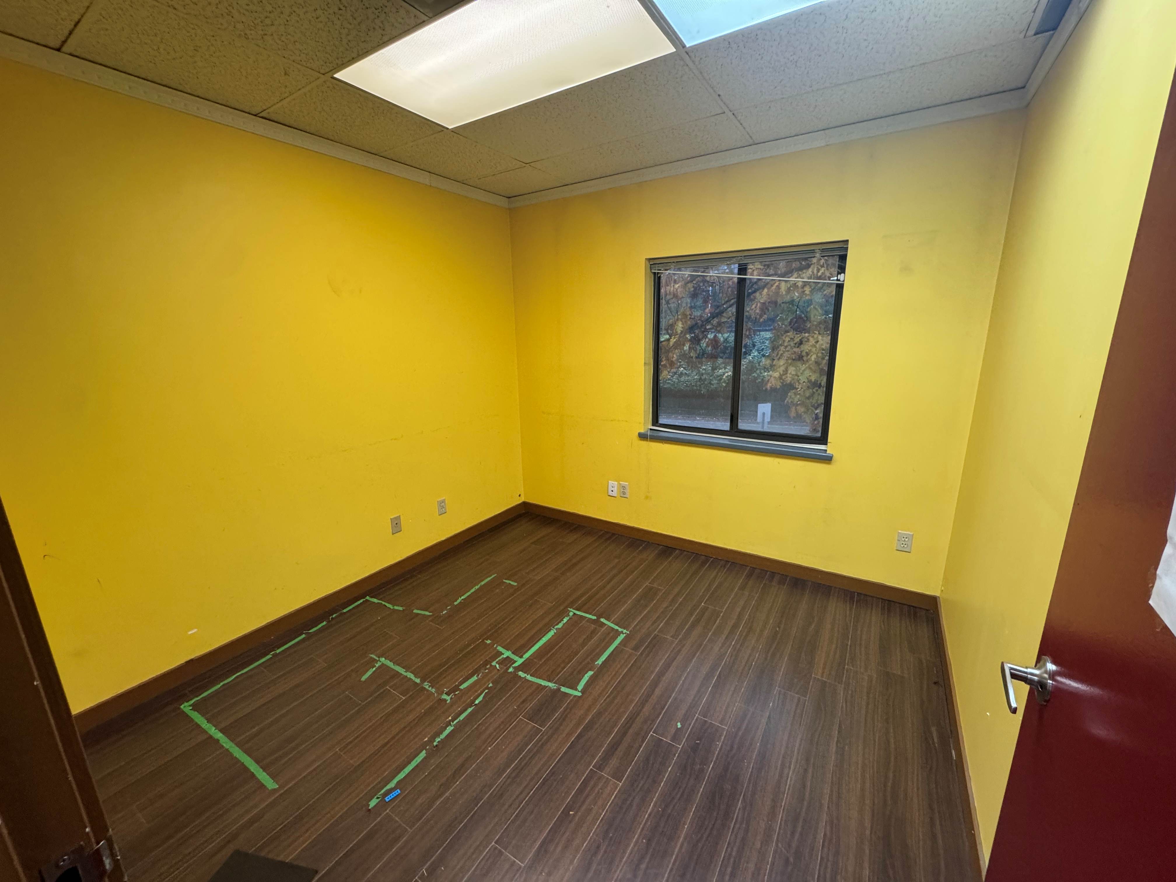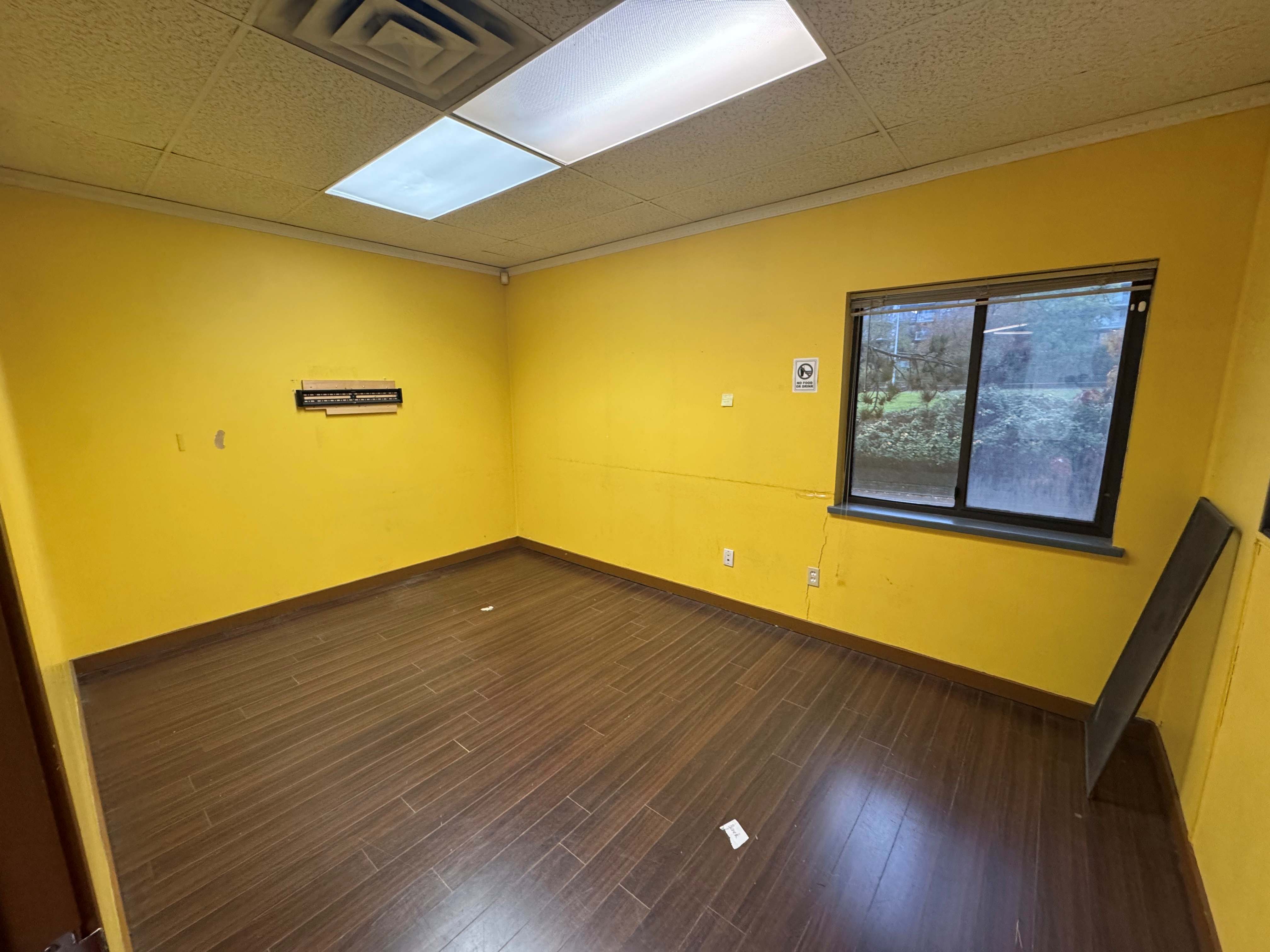 Unit #201 is a second-floor, end unit with a north-facing view. It features an open space, four private offices, a kitchenette, and a washroom.